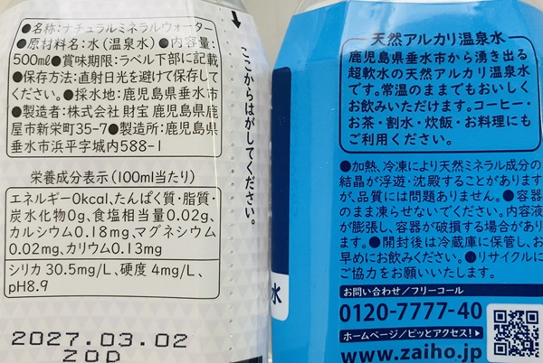 鹿児島県垂水市の名水として知られる「財宝天然アルカリ温泉水」。